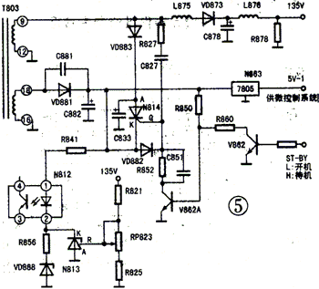 当开关电源+B 135V端电压下降至11V左右,其他各次级几乎无电压输出时,+B电压由VD888(5.6V)稳压值及R856阻值所决定,+B端电压不再下降。此时,由VD883整流、C833滤波所得到的约11V左右电压经可控硅N814 A-K极后通过R841向光电耦合器N812提供误差电压,还经N863(L7805)稳压(由于开关变压器T80318脚此时已几乎无电压输出,所以VD881处于反偏截止状态),继续向主板上微控制系统提供5V-1工作电压,此时开关电源处于低功耗节能状态,整机功耗小于1W。