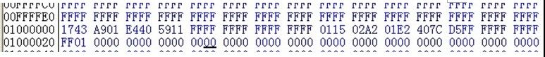 3),修改01000000 段数据为1743 A901 E440 5911 FFFF FFFF FFFF FFFF 0115 02A2 01E2 407C D5FF FFFF FFFF FFFF