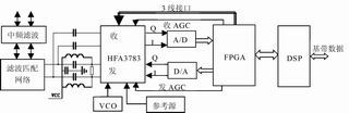 HFA3783是Intersil公司为半双工无线应用而推出的综合芯片,它包含了正交调制和I/Q路解调所有必需的功能模块。它的中频接收AGC放大器具有600 MHz 频率响应范围和70 dB电压增益,并且有超过70 dB的增益控制范围;发送输出也有70 dB的增益控制范围。它的接收和发送中频可以共用一个差分匹配滤波网络,以减少在单中频半双工发送器中所必需的滤波器件数量。在接收模式中有直流偏置校正电路和中频电平检测等功能。其内部混频器由一个宽带正交本振发生器驱动,中频频率设置及PLL环同步参数由一个3线串(阳光电子学校维修专家认为:)行接口控制,它只需要低电平的外部VCO和频率可达50 MHz的参考源。其功能模块如图2所示。