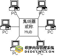星型结构是 古老的一种连接方式,大家每天都使用的电话都属于这种结构,如图3所示。其中,图2(a)为电话网的星型结构,图2(b)为目前使用 普遍的以太网星型结构,处于 中心位置的网络设备称为集线器,英文名为Hub。