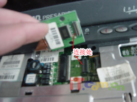 主板正下方有一块小板子,两排小细针和主板相连着,电池口、硬盘连接口、CMOS、电源主芯片都集成在上面所以断一根针很有可能全部设备都用不了,所以笔者多次提醒读者:没经过专人培训 好不要私自拆笔记本,因为很细小的东西都会影响整机的性能。