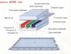 目前的PDP多采用三电极表面放电的工作方式,其单元结构如图所示。从上到下依次为前侧玻璃基板、扫描电极(Scan)和保持电极(Sustain)、介电层、保护层(MgO)、RGB磷光粉、隔离墙、地址电极(Address)和后侧基板。前后玻璃板密封在一起形成PDP显示屏。