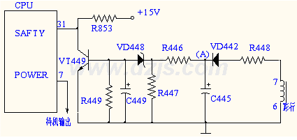 CPU的(31)脚为保护端子,正常工作时,电压接近5V,当行电路出现异常而引起行逆程脉冲过高时,A点电压会上升,VD448导通,VT449饱和,(31)脚变为低电平,CPU进入保护状态,并关闭总线,同时从(7)脚输出待机控制电压,使整机进入待机状态。下图是三洋A8芯的保护电路: