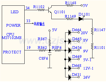 CPU的(19)脚为高电平,当5V—1、9V、8V、20V、12V—1及26V电源中的某一路出现短路现象时,(19)脚就变为低电平,CPU进入保护状态,并从(33)脚输出交替变化的高/低电平,使指示灯闪烁,以作故障指示。由此可见,当I2C总线彩电出现待机(不能二次开机)故障时,千万别忘了检查CPU的保护端子。