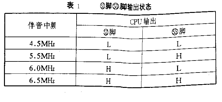 1.手动式制式切换:当电视机要接收多制式信号时,图象中频电路的选频特性需要改变,根据所接收的不同制式的要求改变图象中频带宽.另外,FM鉴频器要能对上述四种不同频率的伴音信号进行鉴频还要求用不同的带通滤波器把所需的伴音中频信号选出来,为了能用同一FM检波器解调不同频率的第二伴音中频信号,其鉴频回路参数也必须要作相应的改变.所有这些需要用开关信号对相应电路进行切换.这里我们以日本松下M16机芯彩电为例说明:是此机芯伴音制式控制电路,伴音中频电路的控制信号来源于IC1213(CPU)的52和53脚,它们的输出状态由键盘控制.它对应的52.53脚输出状态如表1,由表1可看出,CPU52脚53脚输出分别经Q107,Q109缓冲后分为三路:一路经二极管D103,D104进行运算去控制开关管Q108,Q116的状态,从而改变图象中频电路的带宽.第二路由10脚和9脚送入IC201内经逻辑电路译码分别控制两个四通道模拟开关的工作状态,以实现伴音中频陷波和选通.第三路分别通过电阻R252.R243.R244去控制FM检波器中的二极管开关改变鉴频回路的参数,实现正确解调.