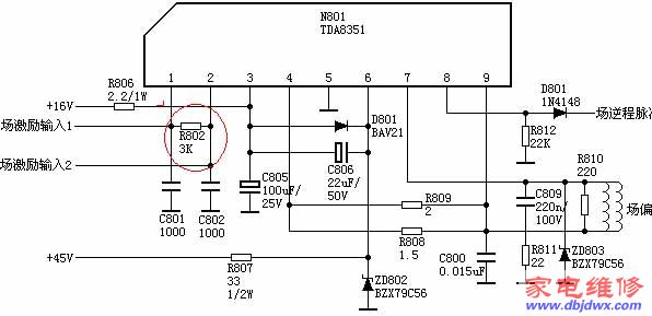 | 前两天修了一台tcl2575d,图象2秒闪灭一次图象(光栅不变)其它都好,重写存贮器好,但场幅小,进不了总线,cpu是m19v2-z,小信号om8838,场tda8351 有资料介绍 将普通遥控器线路板上J03位置插上一只二极管,方向与旁边之D03相同,改装完成后按遥控器“菜单”二下,即可进入I2C总线,以节目“+、-”选择调整项,以音量“+、-”调整参数,“菜单”退出。可拆开遥控器,没有那些位置.没办法. 那晚突发奇想,其它机可动场反馈取样电阻调场幅,8351电路呢,试一下看,在分析8351工作原理时,发现其它之电阻不敢动,只有在8351两平衡输入端上打主意,示波器**用表测量8351-1.2两个输入端,有相反之锯齿波,1.2脚有个3.3K电阻,改变这个电阻阻值可改变场幅大小,调整为3.9K,幅度正合适.