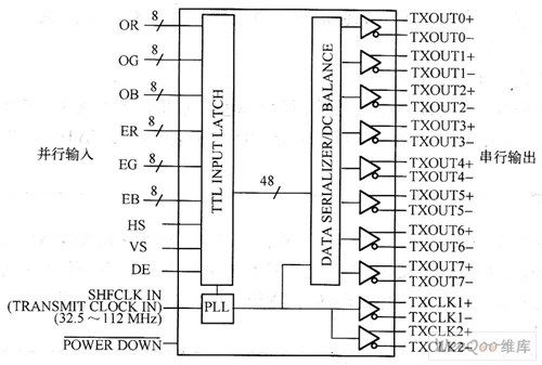 图4所示为十通道LVDS发送芯片(DS90C387)内部框图。包含了八个数据信号(其中包括RGB、数据使能DE、行同步信号HS、场同步信号VS)通道和两个时钟信号发送通道。