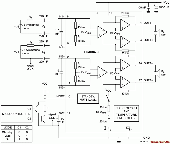 TDA8946J 是一个双通道音频功率放大器,内含两个BTL放大电路.在供电电压为18V负载为8欧时,可以输出2 X 15W的有效功率.