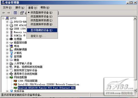 将网卡传输模式更改为100Mbps Full Mode无法拨号上网,其原因非常简单,因为一些ADSL宽带Modem并不一定支持100Mbps Full Mode的传输模式。一旦网卡与宽带Modem的传输模式不协调,会出现丢**的现象,出现用户名和密码错误的691错误也是正常的。 故障点评:网卡故障也**含两类,一类是硬件故障,另外一类是软件故障。在把 网络故障锁定在网卡后,要先用一些诸如Ping的 网络命令检查网卡硬件有没有问题,然后在查看网卡的软件设置。 三、IP地址冲突导致无法上网 故障表现:独立的PCI插槽网卡,旧网卡损坏之后重新购买了同一品牌同一型号的新网卡,安装之后,在设备管理器中显示一切正常。可是,安装了新网卡之后无法上网。网上邻居的属性中,显示“本地连接#2”的字样。践作系统是Windows XP SP2,固定IP的LAN宽带接入用户。 故障解析:将全新的网卡安装在电脑中,在为该网卡设定IP地址时,出现此地址已经被本计算机中的另外一块网卡使用,可是,另外一块网卡已经被卸掉了,为什么还会出现这样的情况呢? 会不会是旧网卡的配置信息没有被删除呢?虽然旧的网卡已经不在计算机中了,可是其配置信息会写入注册表,卸载了硬件,软件没有删除。插上旧网卡,再看网卡的IP配置信息,全部存在。将IP配置信息清除之后,重新安装了新网卡,没有出现IP地址冲突的提示。 由于Windows XP践作系统能够自动识别一些型号的网卡,为此,旧网卡损坏之后,其配置信息仍然存在于注册表中,再安装一块新网卡之后,使用同一个IP将会出现IP冲突的提示。其实,不安装旧网卡,一样可以删除旧网卡的配置信息。在“设备管理器”中,点击“查看”选择“显示隐藏的设备”,可以看到被移除的硬件设备信息,卸载之后就可以了。  | | 显示隐藏的设备 |