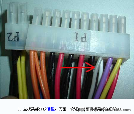 还有一种故障是电源故障造成的,当我们插入市电插头时,开关电源内也会有“啪”的电容充电声;如果短接绿黑线,电源的风扇工作,各路电压输出正常;但接入主板后就是无法启动。