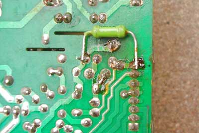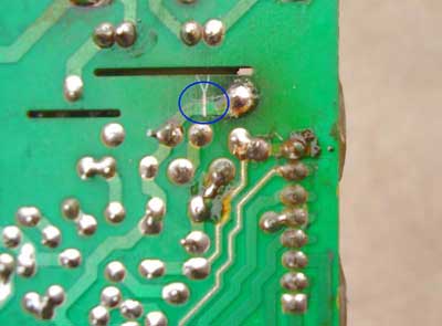 其实,修理电器的方法无外乎观察法、测量法、替换法等等。把电路板拿在手里面观察,从正面看不出任何烧焦损坏的痕迹,倒是在反面发现了电路板上有几处电子元件引脚的周围有点发黑(图五),其中有一处发黑比较明显,翻过来一看, 明显的这一点连接的是一个大功率的电阻(图六),通过查资料得知,相关联的就是开关电源的保护电路。