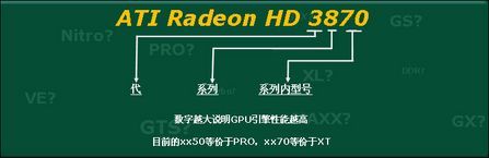 ATi显卡命名规律 和nVIDIA一样,ATi显卡的命名也按照了一定的规律进行,对相同核心的不同型号显卡,以不同的命名规则区分开,以方便消费群体识别好显卡之间的级别,下面我们就说说ATi常见的命名规律。 XTX > XT > XL/GTO > Pro/GT > SE XTX:ATI系列中 高端显卡型号的后缀,如:1800XTX,1900XTX。这个后缀编号都是当时 高端的ATi显卡所配有的。 XT:这个编号比较有意思,ATi和nVIDIA都采用这个编号,但两者表达的意义却不同,用户需要区分开。 在ATi方面,XT是代表了顶级显卡的型号,一般就运行频率稍低于XTX,XT与XTX的关系就像nVIDIA中GTX和Ultra的一样。我们知道的高端显卡就有Radeon X1950XT、Radeon HD 2900XT,它们都采用了XT这个后缀。 而在nVIDIA方面,XT却是代表了简化版,比标准版更低,如GeForce 5600XT,消费者需要区分开来。但在以后的代数中,nVIDIA也很少用到XT这个后缀命名。 XL:用于ATi高端显卡系列的后缀,级别比顶级级别的XT低,主要表现在频率和管线上有所缩水。 GTO:是ATi较为特殊的命名后缀,也是用于中高端显卡系列,其意义就有点类似于nVIDIA的“GS”一样,比XL级别稍低。 Pro/GT:Pro和GT的级别都要低于XT,一般来说,采用同一核心代号的ATi显卡,Pro的级别要稍高于GT,如X1950Pro和X1950GT,主要表现在运行频率上,Pro要高于GT。但我们需要区分清楚,当采用不同核心代号的ATi显卡时,GT的级别是可以高于Pro的,如X1650GT和X1650Pro,单从命名上看貌似X1650Pro要高级于X1650GT,但实际却是相反的,X1650Pro采用了RV530的显示核心,要低级于1650GT采用的RV560,因此X1650Pro的级别要低于X1650GT。 SE:全名为“Special Edition”(特殊版),主要用于ATi中低端显卡系列的后缀。采用这个后缀的显卡在管线上会有所缩减。 以上是过去ATi显卡型号中常见的后缀命名规则,在Radeon HD 3000系列之前,我们都可以通过上面的方法基本判断出采用了同一显示核心ATi显卡的级别,但到了Radeon HD 3000系列,这种容易被混乱的命名后缀方法被除去了,改而更加直观的命名方法,下面我们来介绍ATi这种新的命名法则。