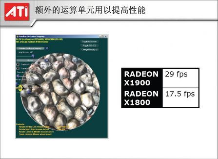 (R580拥有三倍于R520的像素渲染单元) 传统的管线概念(Pipeline)中,像素渲染单元(Pixel Shader)跟Pipeline数目相同,象NVIDIA的G70图形就是这么一个概念;但是ATI在全新的R580图形芯片中,稍微修正了像素渲染单元跟Pipeline的关系。RadeonX1900需要重点强调的地方在于,R580图形芯片拥有16条传统的像素管线(Pixel Pipeline),但是却拥有48个像素渲染单元和16个纹理单元,算术处理能力是以前旗舰级GPU的3倍,在晶体管数量只增加20%的情况下,渲染能力理论上增加了200%,像素渲染单元跟纹理单元的比例是3:1。实际上ATI在当时的中端显卡RadeonX1600上也使用了这种比例关系,形象点来说RadeonX1900似乎是由四个RadeonX1600组成的旗舰代表。