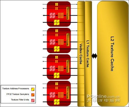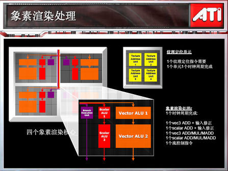 ![]() 当然像素处理引擎的渲染指令**括从显存中拾取数据的纹理践作和完成数学变化的渲染处理践作。实际上这两种渲染指令的使用比例决定者图形芯片像素处理引擎的组成。ATI认为大部分的像素处理都是双线过滤践作或者从整数纹理中进行点取样,并没有多少纹理查找的过程。纹理践作过多依赖于显存容量跟带宽这些外界因素,而算术处理践作则不同,它的处理能力大多数场合取决于像素处理器集成的像素渲染单元的数量。理论上通过相应的约束参数纹理践作生成像素算术纹理,可以降低纹理践作对外界因素的制约。