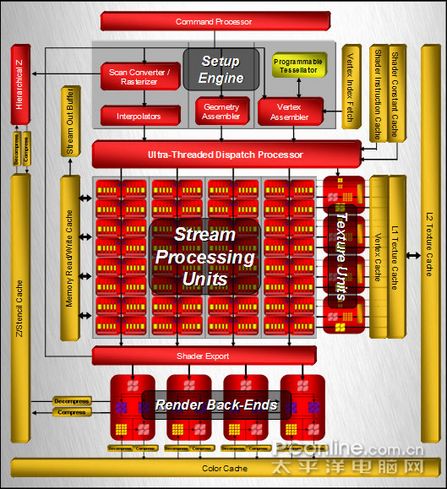 即便ATi在R580中引入了1:3的黄金渲染架构,但传统的渲染架构还是存在弊端的,在目前许多新的大型3D游戏中,许多独立渲染的场景由大量多边形组成,对GPU的Vertex Shader(顶点着色器)要求很大,而这时相对来说,并不需要太多的像素渲染践作,这样便会出现像素渲染单元被闲置,而顶点着色引擎却处于不堪重荷的状态,为了解决这一问题,ATi开发除了统一超标量着色架构(Unified Superscalar Shader Architecture)的R600系列。 得益于80nm核心工艺制程的帮助,Radeon HD 2900XT显卡终于摆脱传统“管线”概念的束缚,采用更为高效的统一超标量着色架构(Unified Superscalar Shader Architecture),内置了高达320个流处理器单元(64*5),全面支持Microsoft DirectX 10.0和Shader Model 4.0,能同时兼容DirectX 10和DirectX 9 与OpenGL等引擎开发的3D游戏。下面是有关Radeon HD 2900XT显卡的核心架构体系图。